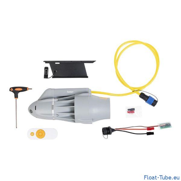 Installation : le moteur est fourni avec un support (pièce noire) à coller sous la toile PVC du float tube à l’aide d’une colle bi-composant. Cette fixation assure une stabilité optimale et un positionnement idéal du moteur pour vos déplacements.