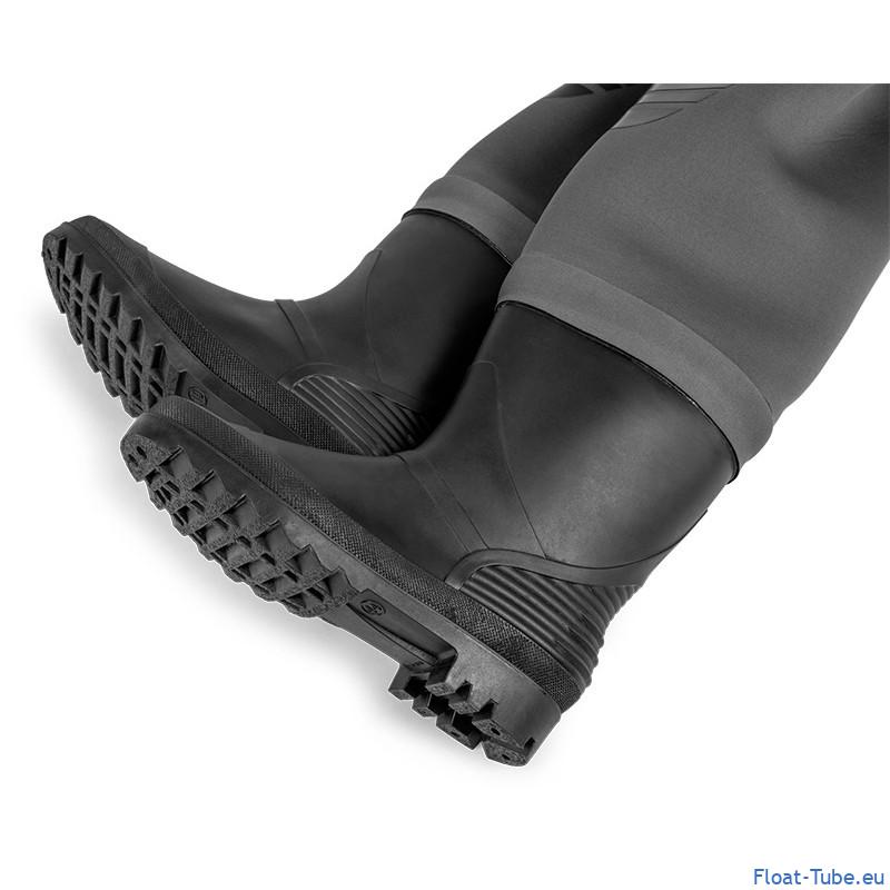 Les Waders néoprène Trophy Zebco prennent la forme de cuissardes robustes, avec des bottes en caoutchouc directement fixées au wader. Cette construction « bottes intégrées » évite d’avoir à gérer des chaussures séparées et simplifie l’équipement au bord de l’eau.